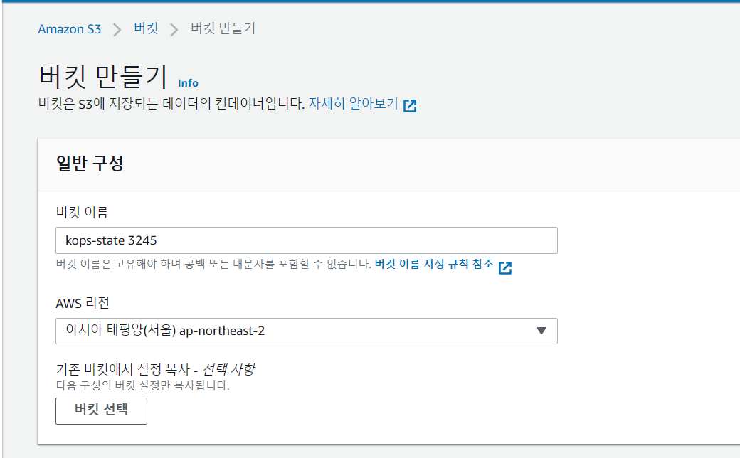 - 버킷 이름은 고유해야 하기에 랜덤상수를 붙여 생성합니다. (공백이 없어야합니다.)
