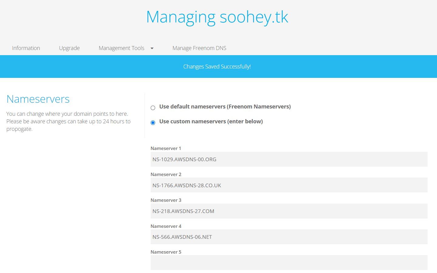 생성된 네임서버는 도메인에 연결시켜야 합니다. 저는 soohey.tk라는 도메인에 연결해야 하므로 Freenom에서 네임서버를 등록해주면 됩니다.