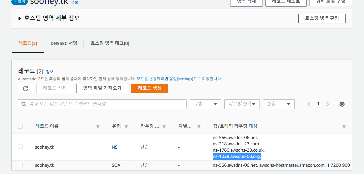 route 53으로 이동해 도메인의 네임서버 생성(레코드 생성)하기.