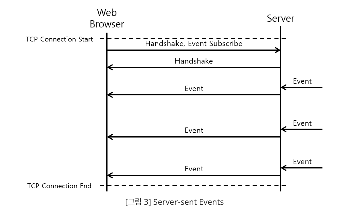 - 이는 응답마다 다시 요청하는 롱 폴링에 비해 효율적이고 서버의 상태 변경이 잦은 경우 유리하지만 연결을 언제까지 맺을 건이지에 관한 유효성 관리등의 부담이 발생한다.