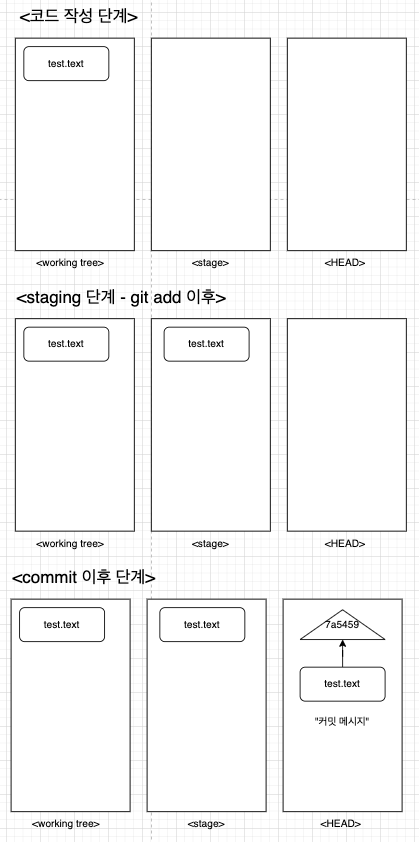git status로 워킹트리, 스테이지, 헤드커밋의 세가지 저장공간의 차이를 보여준다. 커밋 이후 git status명령을 내리면 clean 상태임을 보여주는데 세가지 공간의 내용일 동일함을 의미한다.