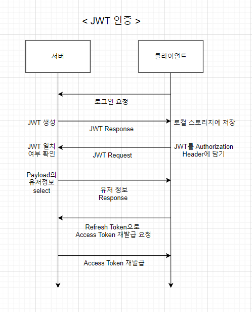 - 클라이언트는 받은 JWT를 로컬 스토리지에 저장한다. 이후 Request마다 Authoriztion header에 Access Token을 담아서 보낸다.