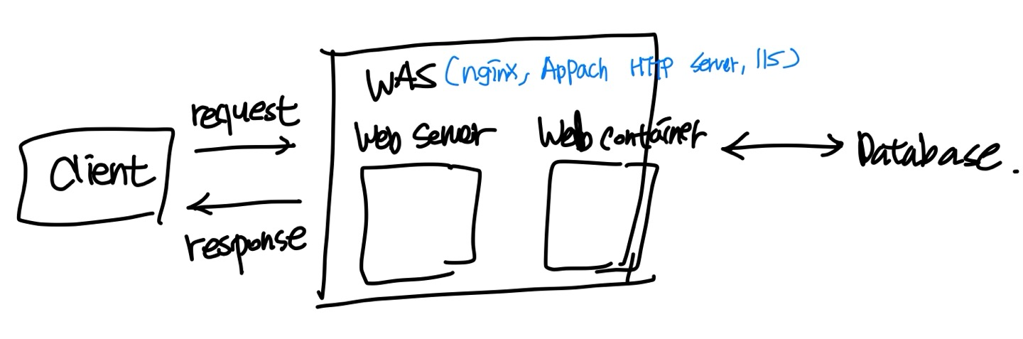 보면 크게 Client, WAS (web server + web container), Database가 있다는걸 확인할 수 있다.