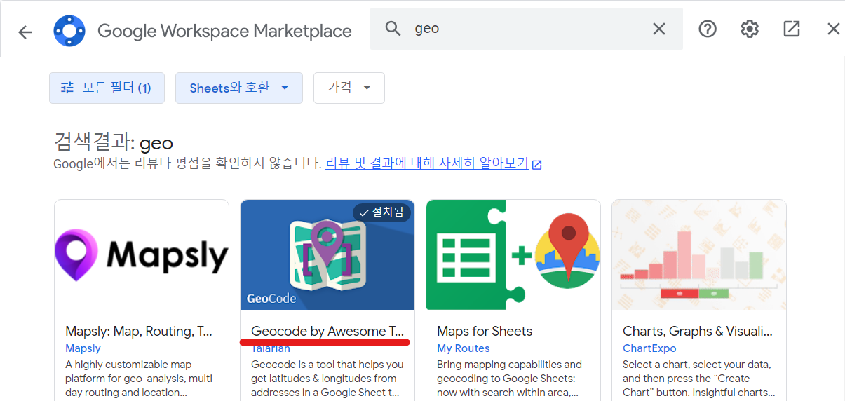 우측에 있는 + 버튼을 누른뒤, Geocode by Aweso를 설치한다.