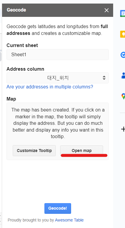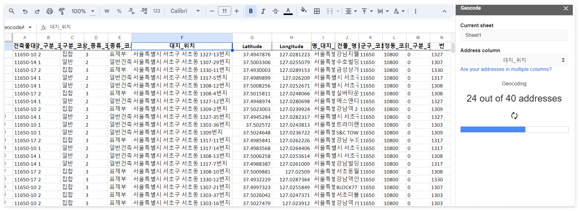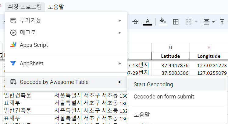 설치가 완료되면 확장 프로그램 탭이 생성된다. 확장 프로그램 > Geocode by Awesome Table < Start Geocoding 을 누른다.