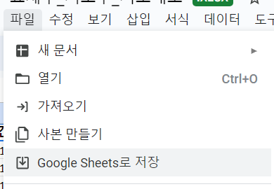 구글 드라이브에 파일을 업로드한 뒤, 파일 > 구글시트로 저장을 누른다.
