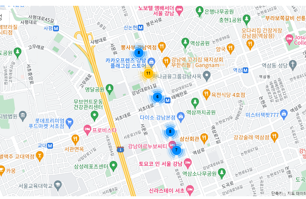 카카오맵에 핀을 꼽거나 영역을 표시하려면 위도,경도 데이터가 필요하다.