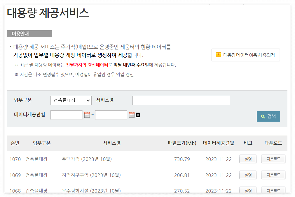 업무구분 > 건축물대장으로 검색한 뒤, 아래로 스크롤하면 다양한 데이터를 확인할 수 있다.
