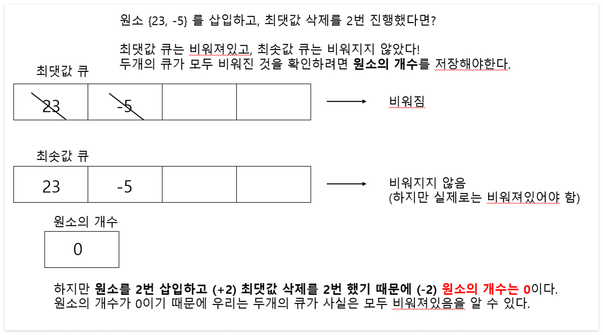 원소의 개수가 0이 되면 최댓값 큐와 최솟값 큐를 모두 비워주면 오해를 없앨 수 있을 것이다.