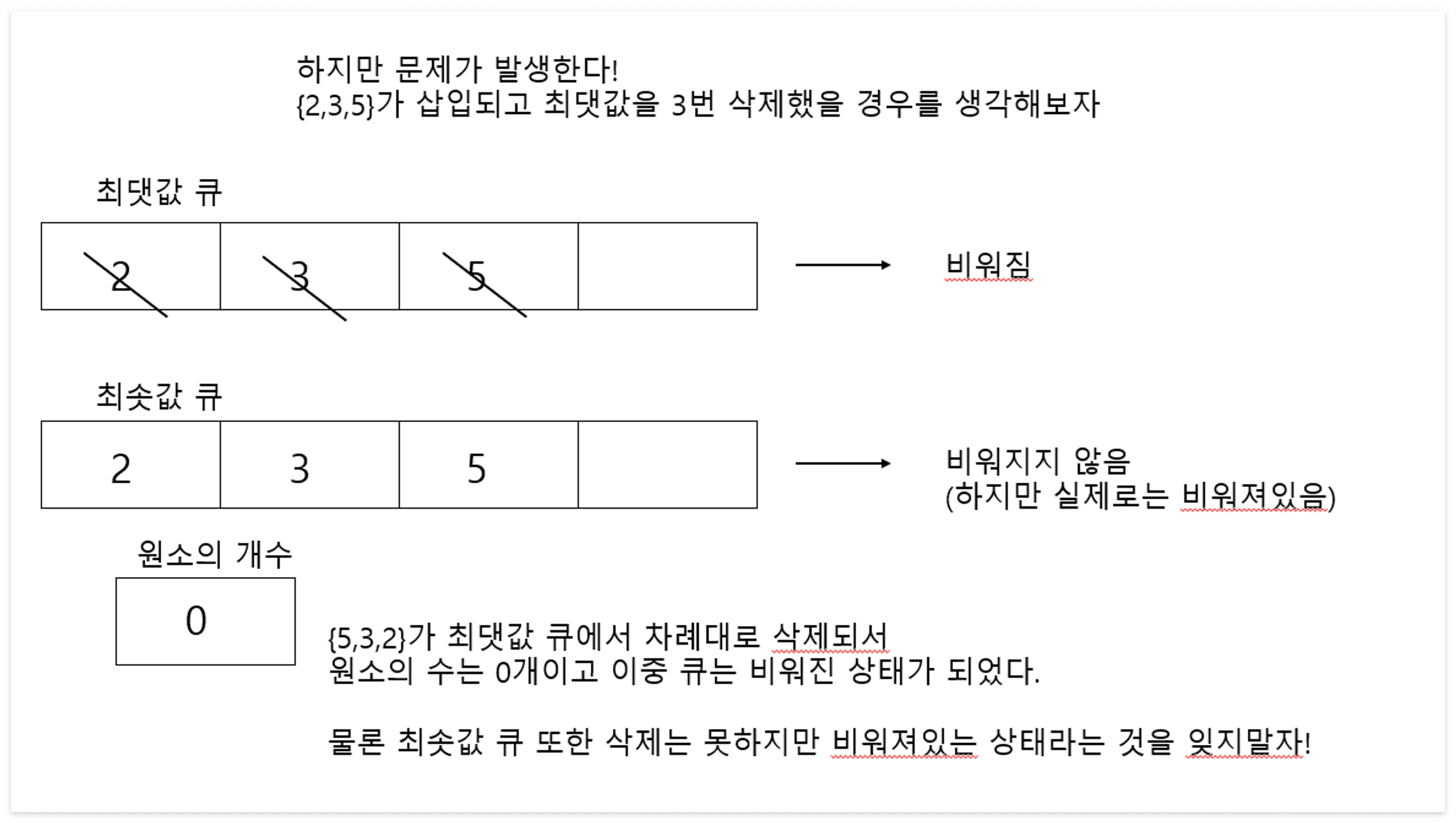 이렇게 된다면 최솟값 큐와 최댓값 큐의 내부 원소가 다르기 때문에 최댓값/최솟값을 뽑을 때 오해가 발생할 수 있다.