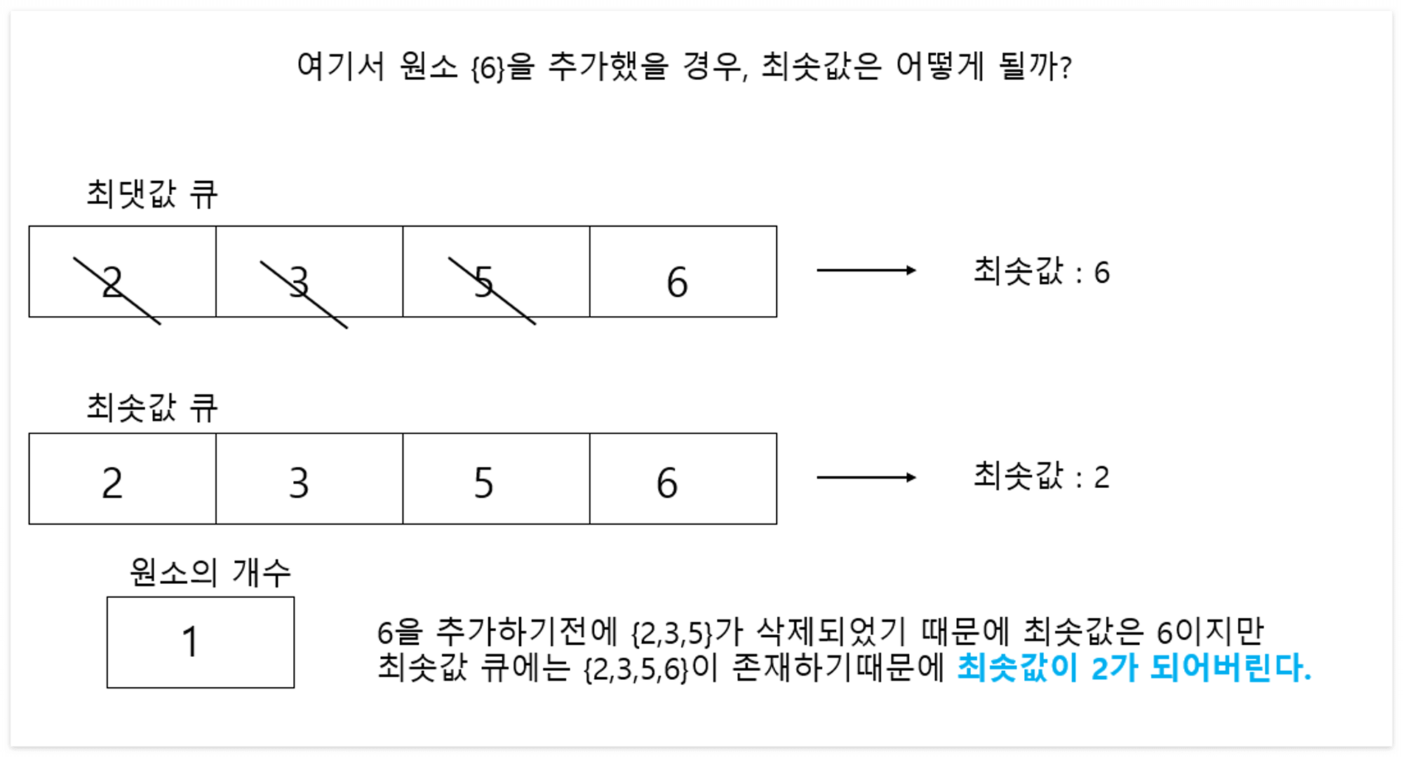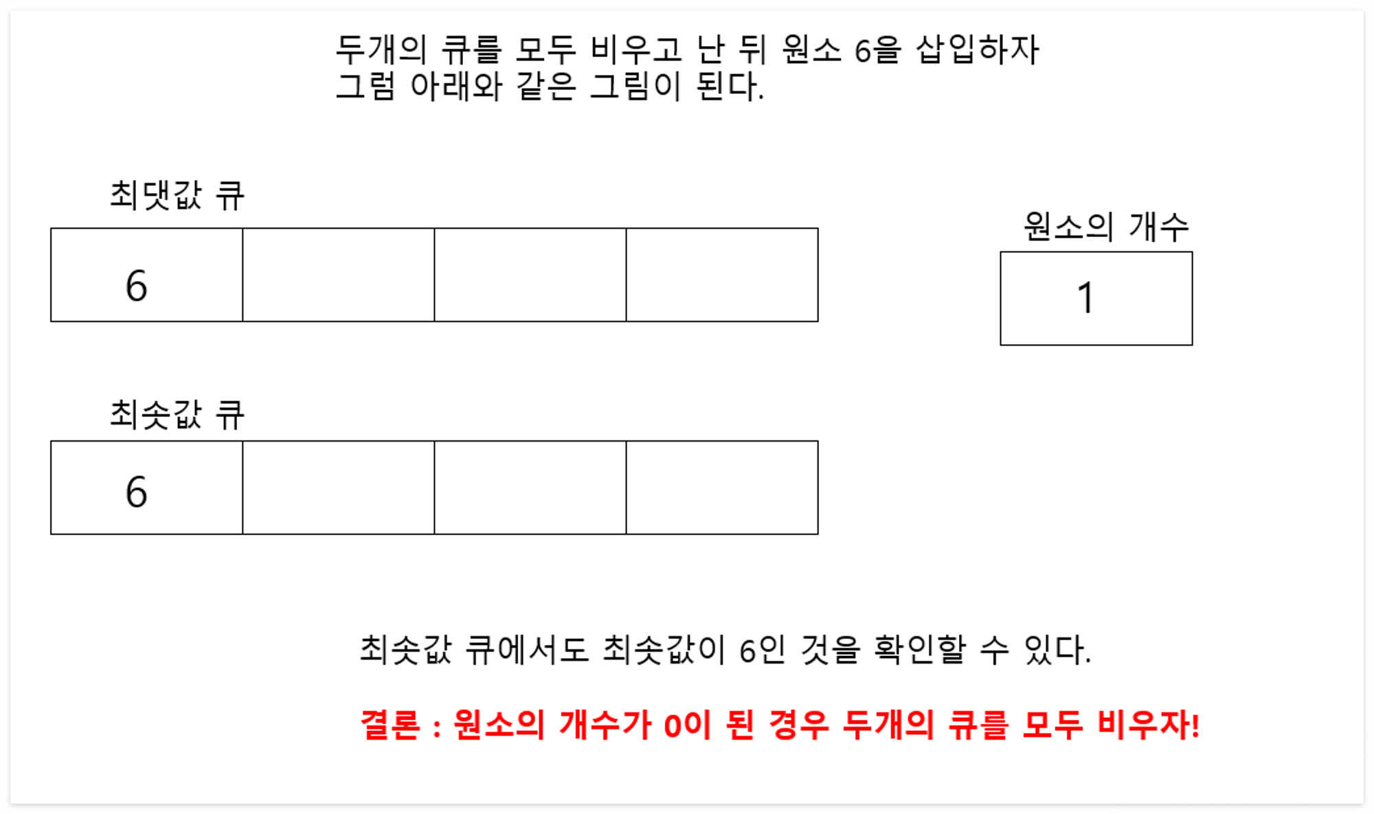 위의 내용을 토대로 최댓값을 관리하는 큐와 최솟값을 관리하는 큐, 원소의 개수를 저장하는 변수가 필요하다는 것을 알게 되었다.