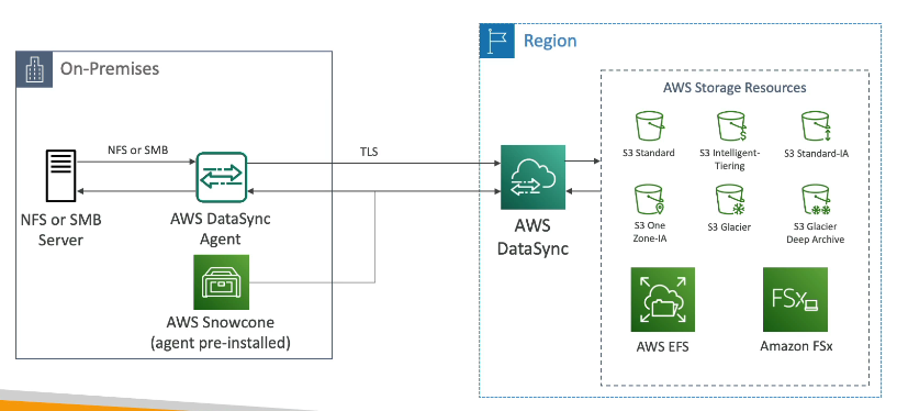 - DataSync는 AWS Storage 리소스들로 전송할 수 있음 (S3, EFS, FSx … )