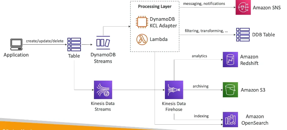 - 애플리케이션이 DynamoDB 테이블에서 작업을 생성/업데이트/삭제시 데이터가 DynamoDB Streams나 Kinesis Data Streams로 전송됨